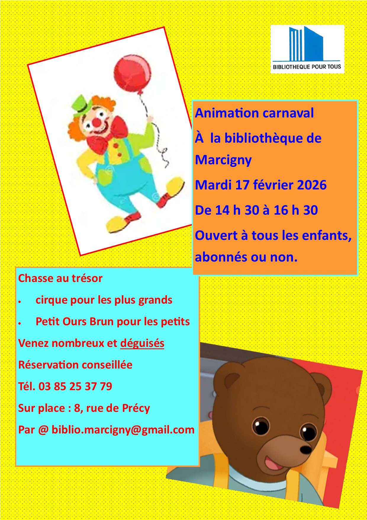 Les enfants sont invités à un après-midi récréatif sur le thème Caranaval : chasse au trésor sur le thème du cirque pour les grands et sur la thème de Petit Ours Brun pour les petits.