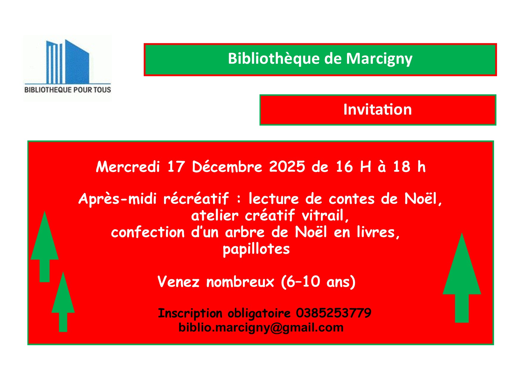 Les enfants de 6 à10 ans sont invités à un après-midi récréatif sur le thème de Noël : lecture de contes, ateleir créatif vitrail, confection d'un sapin de Noël en livres.